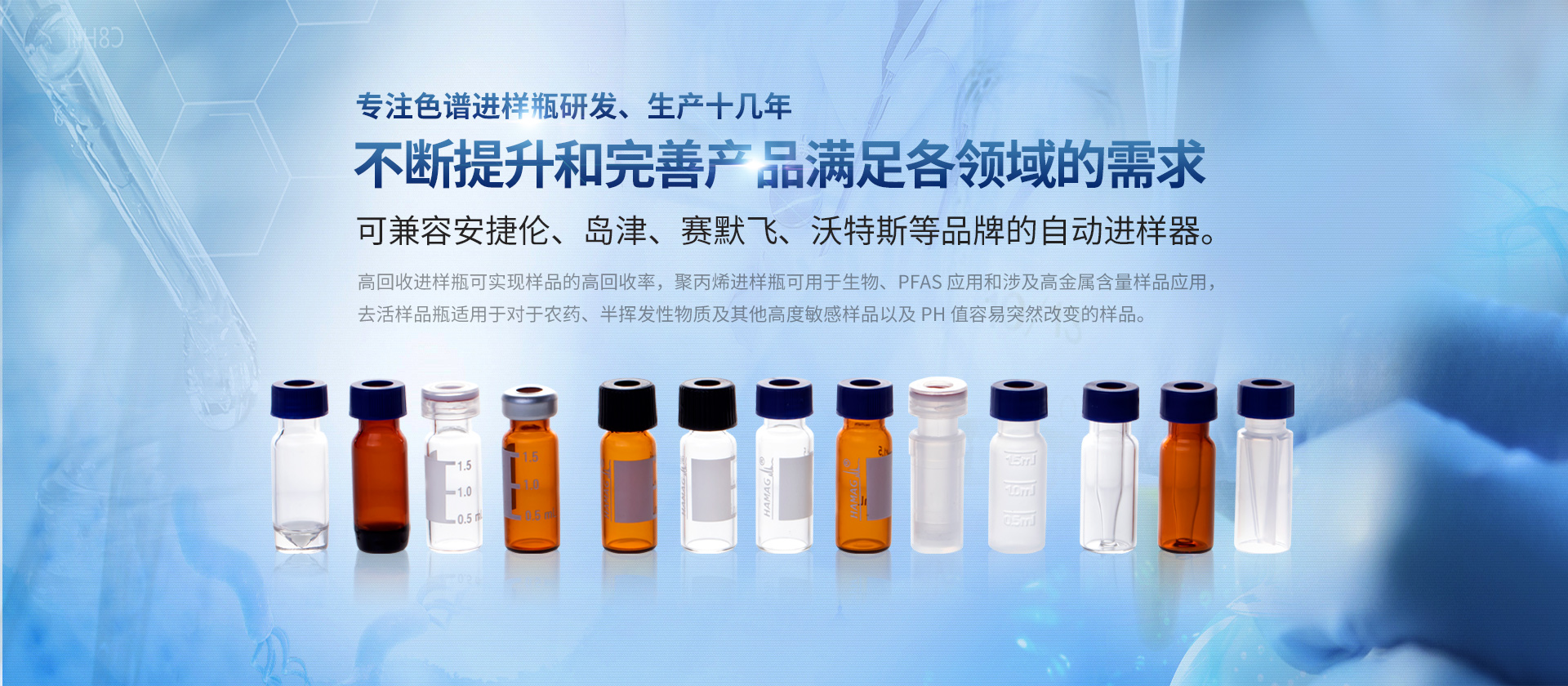 浙江哈邁科技有限公司(簡稱HAMAG),成立于2005年,總部位于美麗的海濱城市寧波,是中國優(yōu)質色譜進樣瓶、樣品瓶供應商,是一家專業(yè)從事色譜耗材的科研、設計、生產、銷售和系統集成為一體的生產型企業(yè)。經過十幾年的研發(fā)與努力,通過和國內外多個科研部門,浙江大學理工學院,同時與品牌:安捷倫、沃特世、島津等公司的技術交流與學習,我們成功的研制開發(fā)出實驗室分析設備專用的各種型號的自動進樣瓶、頂空瓶及其配套蓋墊;特氟龍與硅膠復合墊片;特氟龍/硅膠制品;創(chuàng)新型固相萃取儀;針式過濾器等幾十種實驗室耗材及關聯產品...